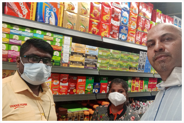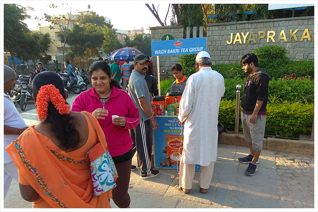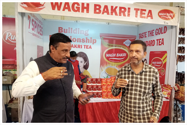 Wagh Bakri tea promotion at public parks and an exhibition, door-to-door activity and providing sales staff in a supermarket.